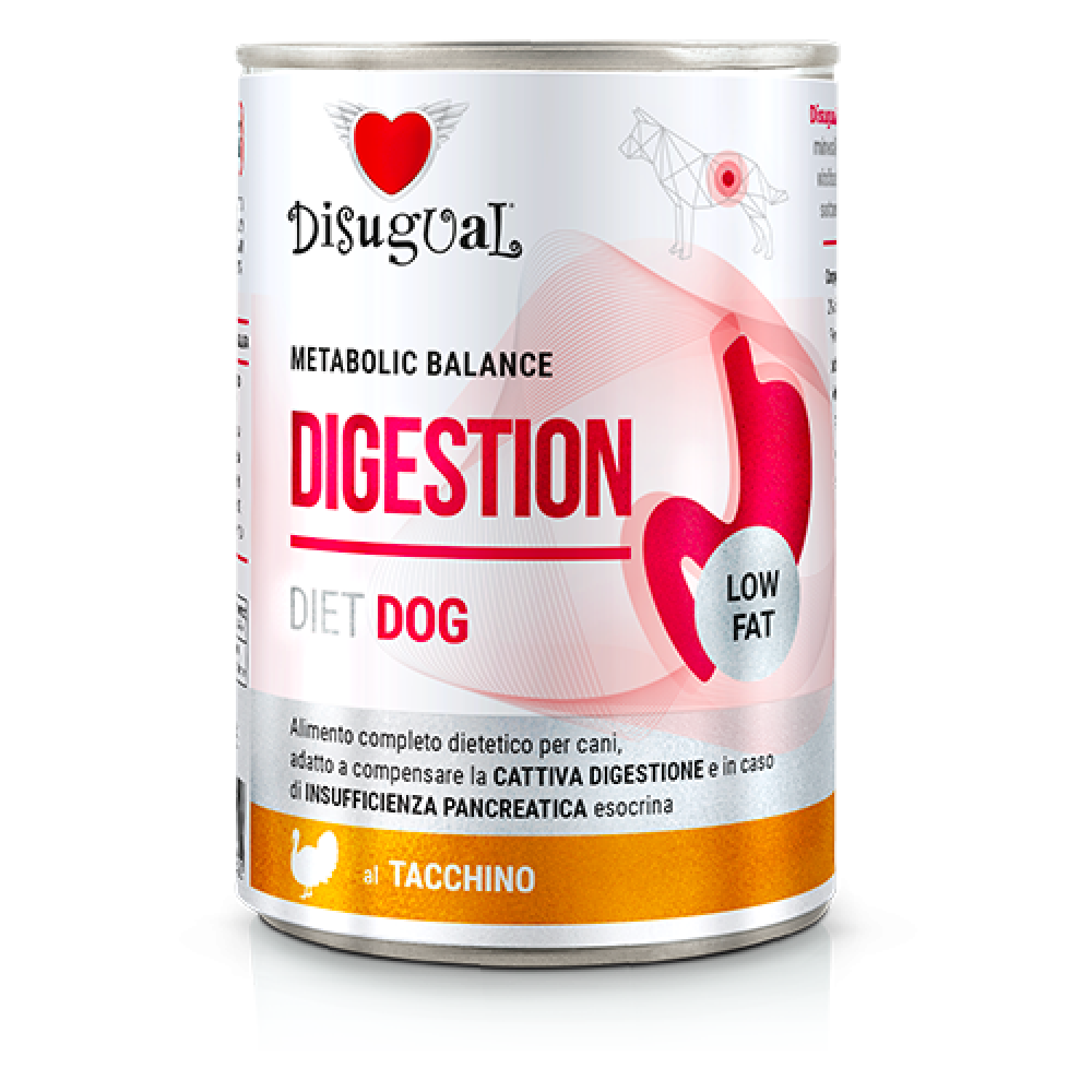 Disugual DIGESTIÓN BAJA EN GRASA es una dieta equilibrada que contiene vitaminas y minerales, suplementada con prebióticos (XOS y MOS) y polifenoles extraídos de Vitis vinifera. La dieta está formulada con proteínas hidrolizadas de alta digestibilidad y fibra prebiótica.