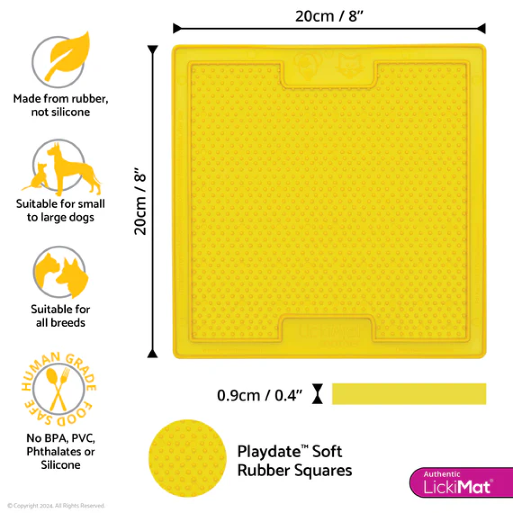 Fabricado con TPR no tóxico apto para uso alimentario. 20 x 20 cm / 8″ x 8″ Apto para todos los perros y gatos (supervise a su mascota las primeras veces hasta asegurarse de que no morderá la alfombrilla). Apto para congelador Apto para microondas Lavable a mano