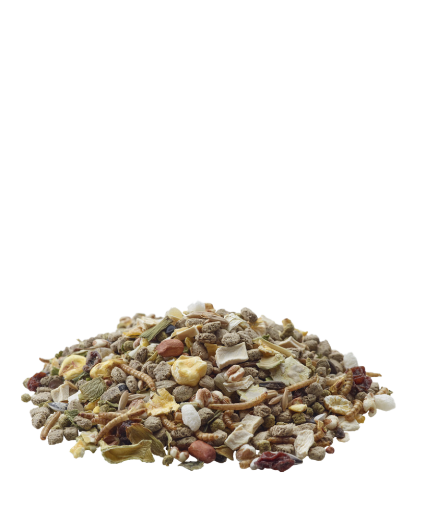 Con gusanos de harina como proteína animal para una dieta equilibrada. Mezcla naturalmente variada, llena de cereales y verduras como guisantes y chirivía, y enriquecida con frutas como la piña. Sabrosa mezcla con trocitos extruidos para una ingesta y digestión óptimas; sin pellets prensados. Sin colorantes, saborizantes ni conservantes artificiales.